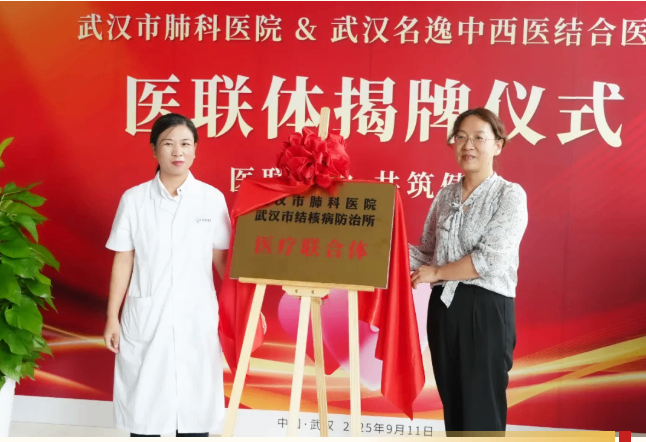 2025年9月11日上午10时,武汉名逸中西医结合医院与武汉市肺科医院医联体签约暨揭牌仪式在名逸医院一楼大厅隆重举行。两家医院正式建立医疗联合体合作关系,标志着双方在整合医疗资源、提升服务能力、深化中西医协同发展方面迈出了坚实的一步。